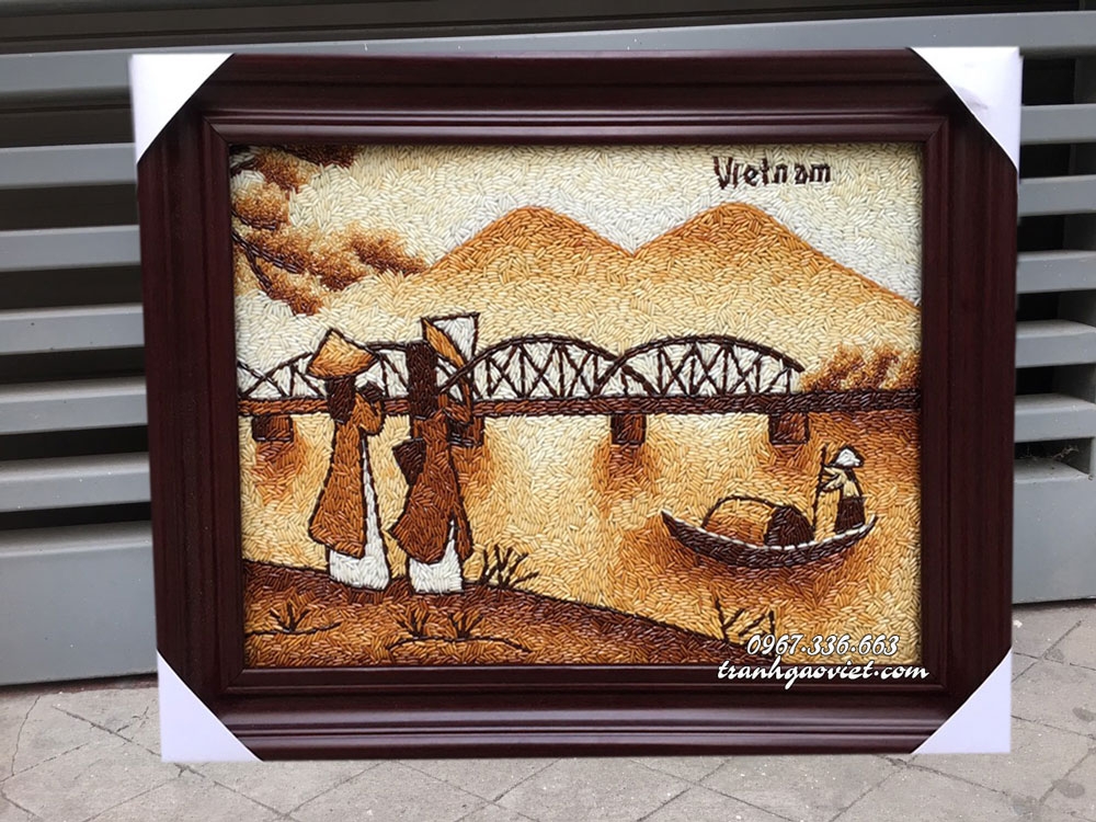 Tranh gạo phong cảnh cô gái áo dài bên cầu Trường Tiền một trong những mẫu phong cảnh đẹp và đặc trưng về hình ảnh quê hương Việt Nam thích hợp làm quà tặng người nước ngoài hoặc treo trang trí nhà cửa