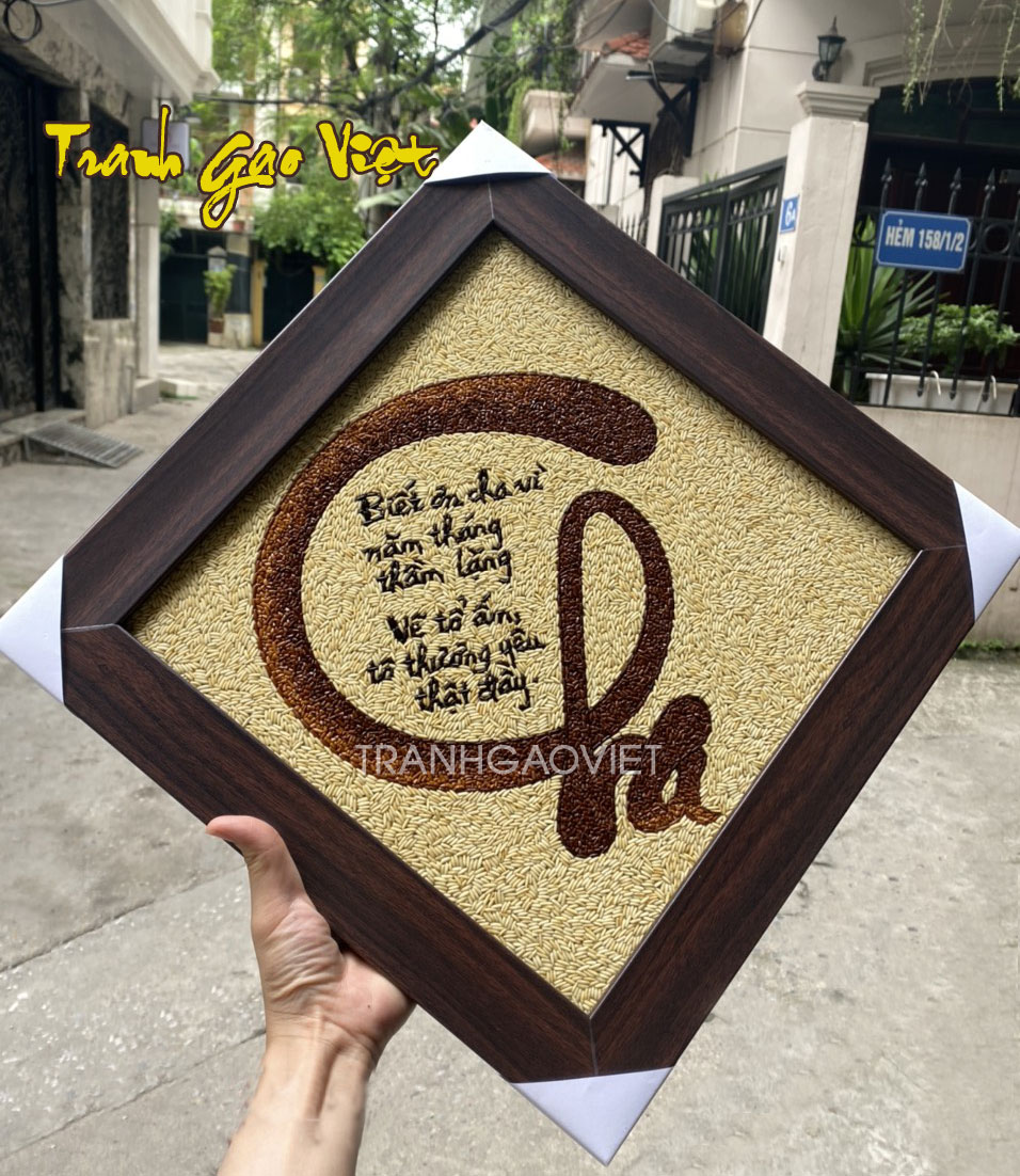 Với tình yêu và sự kính trọng đó, một món quà ý nghĩa dành tặng cha là tranh gạo thư pháp chữ Cha. Tranh gạo thư pháp là một sản phẩm nghệ thuật đồ sộ bởi nó thể hiện sự kết hợp giữa thư pháp truyền thống và chỉn chu trong từng đường nét. Bức tranh gạo thư chữ Cha này được tạo ra bằng cách sắp xếp những hạt gạo rang mộc mạc giản dị với câu câu thơ đầy ý nghĩa thay lời nhắn gửi biết đơn đến bậc sinh thành kính yêu. Sự đan xen của những hạt gạo này tạo ra một kiệt tác nghệ thuật thật sự độc đáo và rất đẹp.