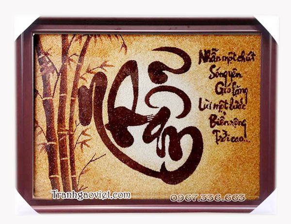 Tranh gạo thư pháp chữ "Nhẫn" thường kết hợp với nhiều câu thơ để mang tính răn dạy con người nên học tính nhẫn nhịn ví dụ
