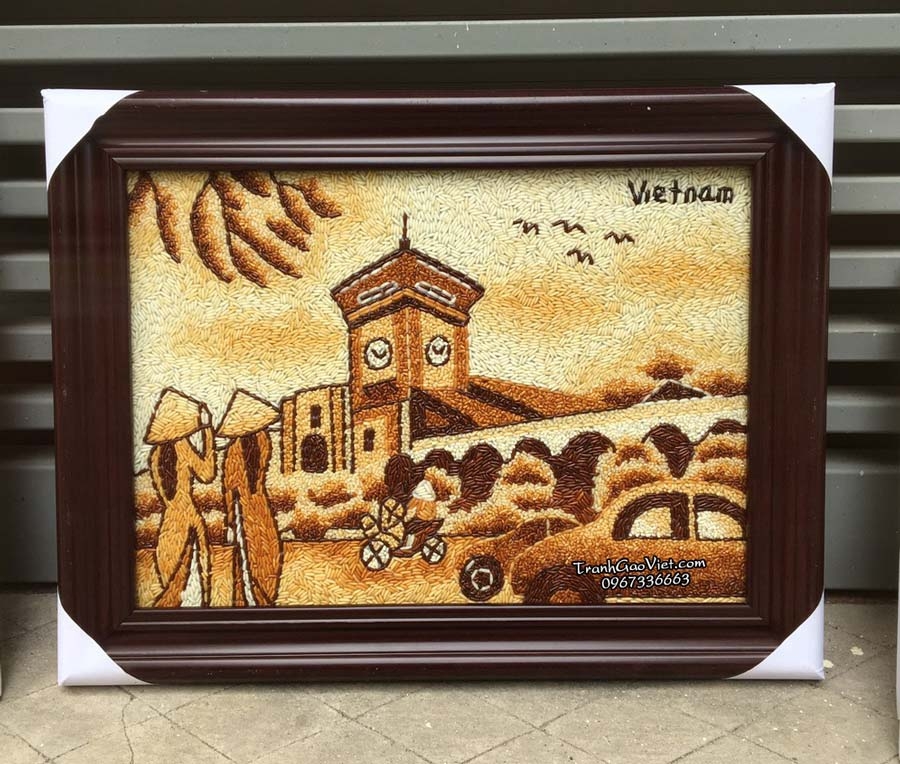 Tranh gạo Chợ Bến Thành với hình ảnh địa danh đặt trưng Sài Gòn xưa và cô gái áo dài với nét đẹp duyên dáng mang đậm hình ảnh và nét văn hóa Việt Nam được nhiều khách hàng lựa chọn làm quà tặng mang đi nước ngoài. Kích thước có thể làm nhiều size khác nhau tùy thuộc theo yêu cầu của khách để có thể tiện mang đi xa.