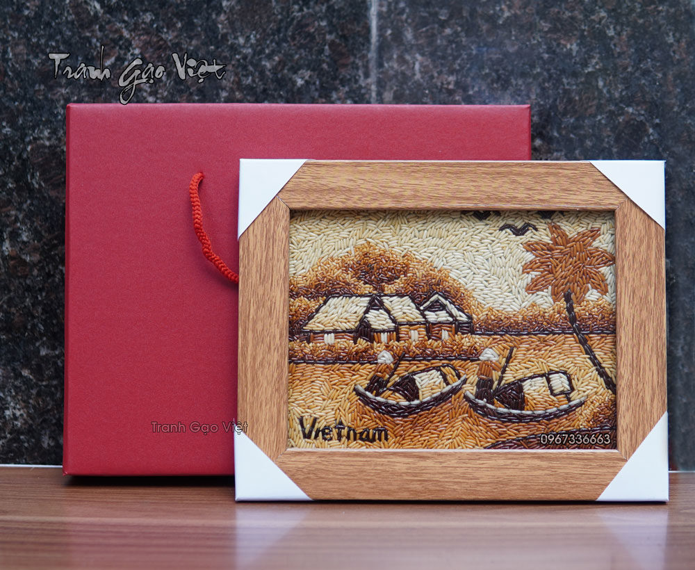 Tranh gạo để bàn chèo thuyền phong cảnh sông nước miền tây