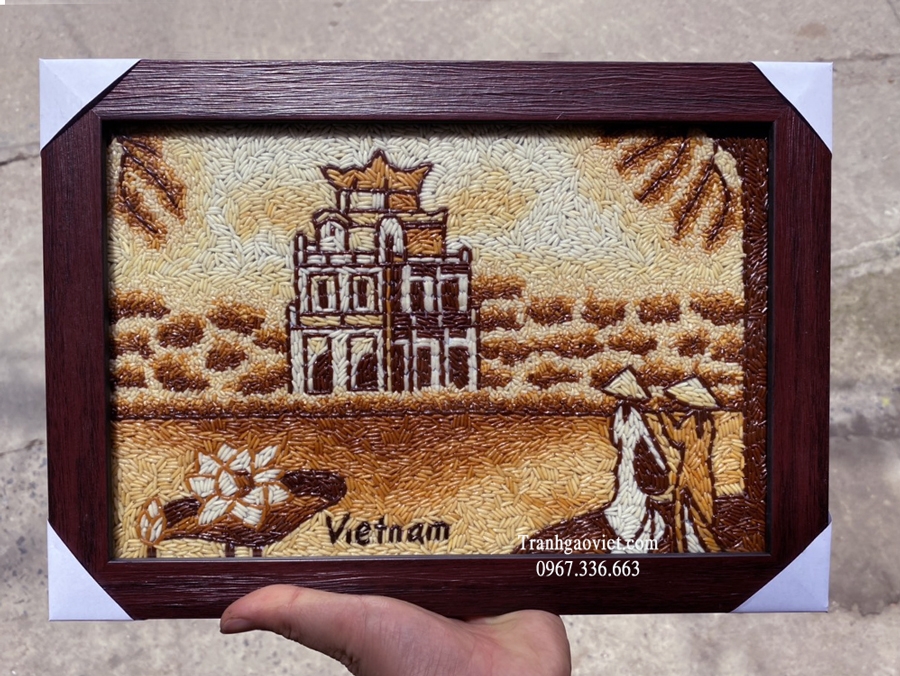 Tranh gạo hoa sen khổ nhỏ gọn thích hợp treo trang trí hoặc làm quà tặng. Tranh có khung kính và hộp đầy đủ