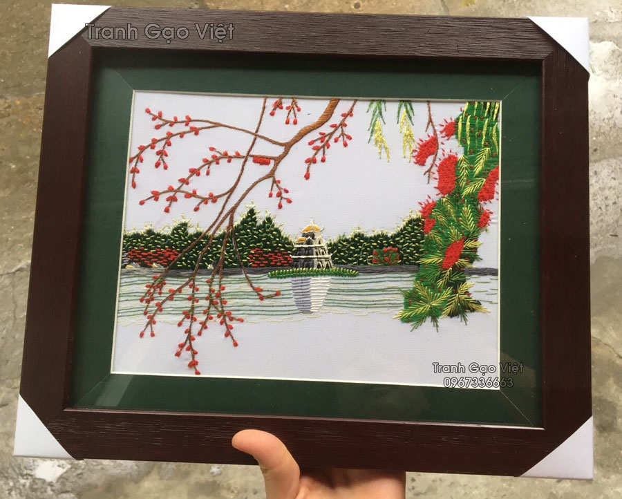 Tranh thêu tay hồ gươm (phố cổ) mẫu đơn giản khổ nhỏ tiện mang đi nước ngoài làm quà tặng